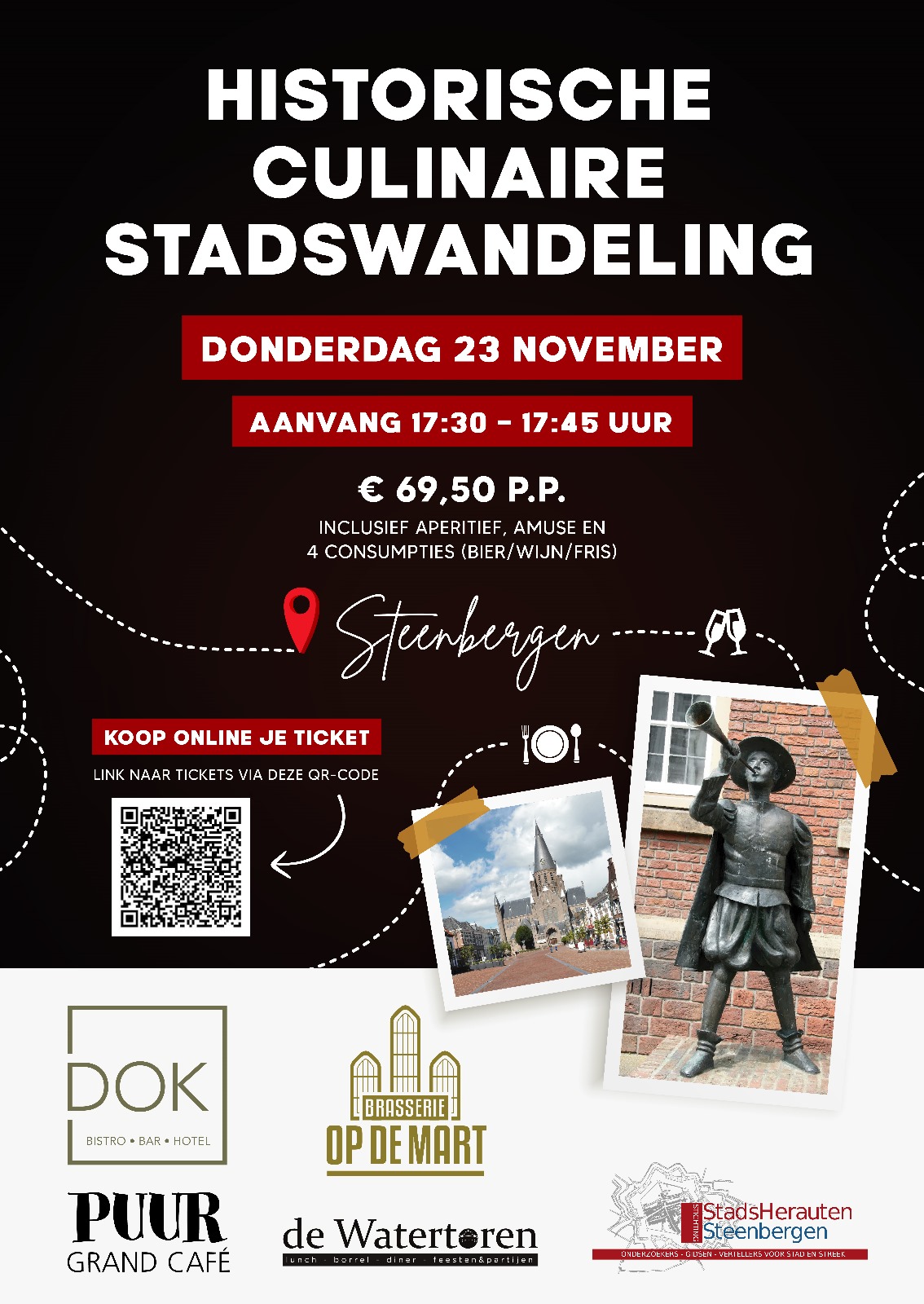 Bij elk restaurant wordt u een gang uit het diner aangeboden met bijpassende wijn.. Op weg van restaurant naar restaurant delen de gidsen van de St. StadsHerauten Steenbergen met jullie de geschiedenis en zorgen voor mooie storytelling.